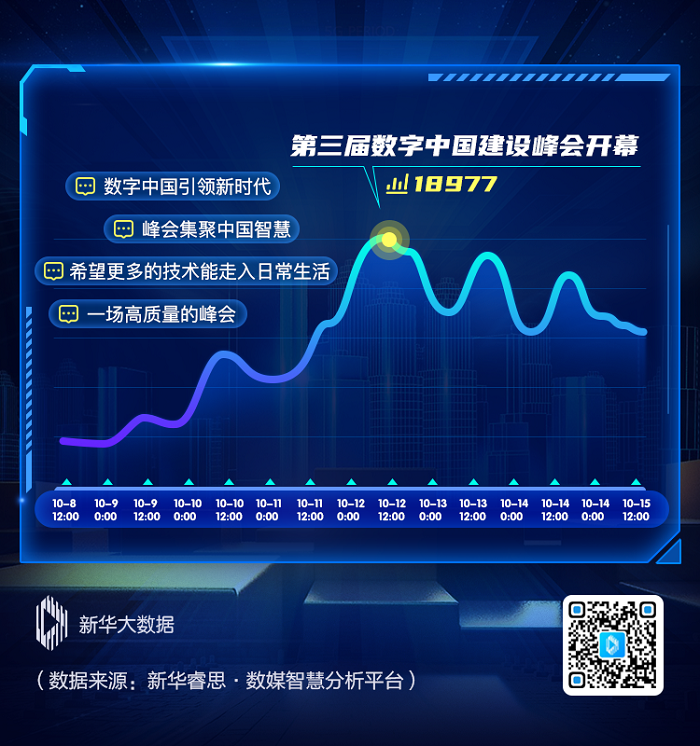 峰会的举办在网络上引起一波“关注潮”。新华睿思数据显示,“数字中国建设峰会”相关话题10月8日以来便在各大媒体平台广泛传播,传播高峰出现在12日,单日传播量突破1.8万条。部分网民对峰会的举办表示赞美与期待,“一场高质量的峰会,一次智慧的碰撞”“数字中国引领新时代”“希望更多的技术能走入日常生活”……可见,峰会的举办让更多的人切实感受到了数字科技的魅力,对未来的数字生活充满无限想象。