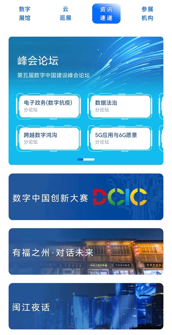 来到“资讯速递”页面,这里届时将上线,各个分论坛的最新鲜资讯,还有“数字中国创新大赛”“有福之州·对话未来”以及“闽江夜话”等活动相关报道。