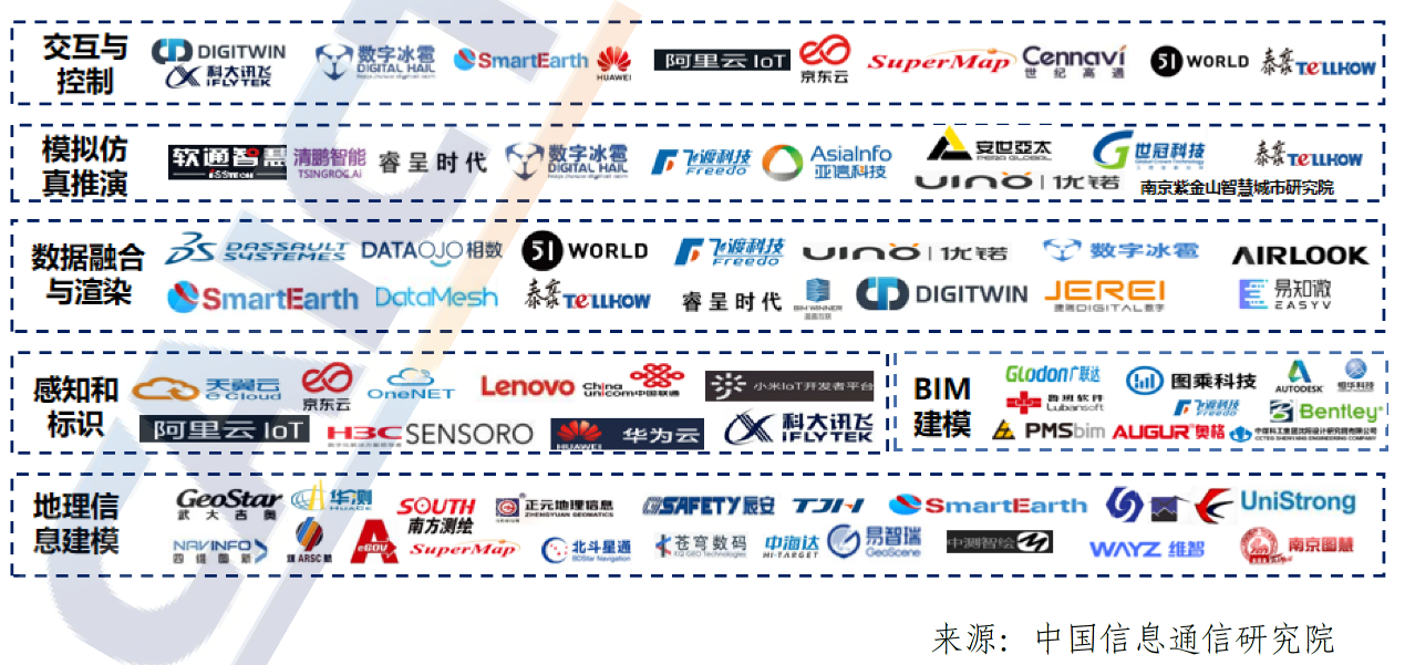 建设城市大脑首先要构建数字孪生城市,包含尽可能多的城市数据资源,为后续“城市治理”、“资源调配”、“仿真计算”等功能打下基础。根据中国信通院报告,数字孪生城市已初步形成空间地理信息类、BIM建模类、感知和标识类、数据融合与渲染类、模拟仿真推演类、交互与控制类等主要产业阵营,产业链条正不断加强,其中不乏华为、阿里云、京东云、科大讯飞、H3C、天翼云、睿呈时代、优锘科技、孪数科技、正元地信等核心技术企业的技术支撑与创新。