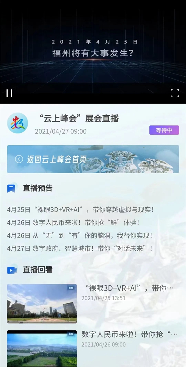 来到“云上峰会”主页面,在这里我们可以看到“云上峰会”的主视觉“云上三山”,其取义福州于山、乌山、屏山,三山之山为福州海峡国际会展中心,凸显福州“山在城中,城在山中”的独特地理特色。