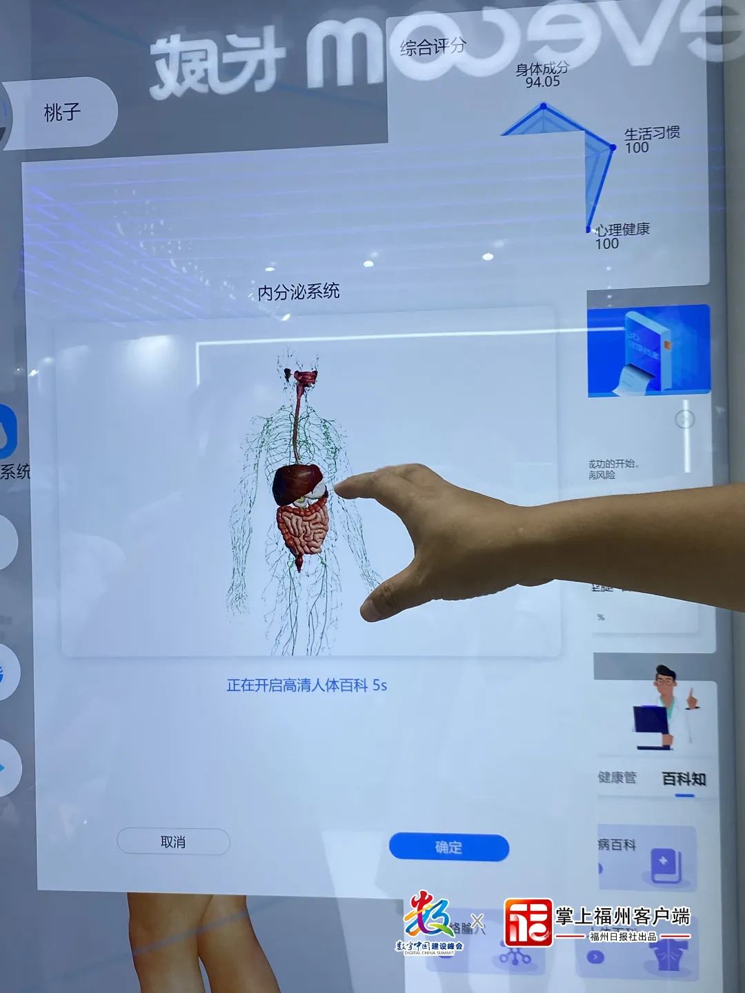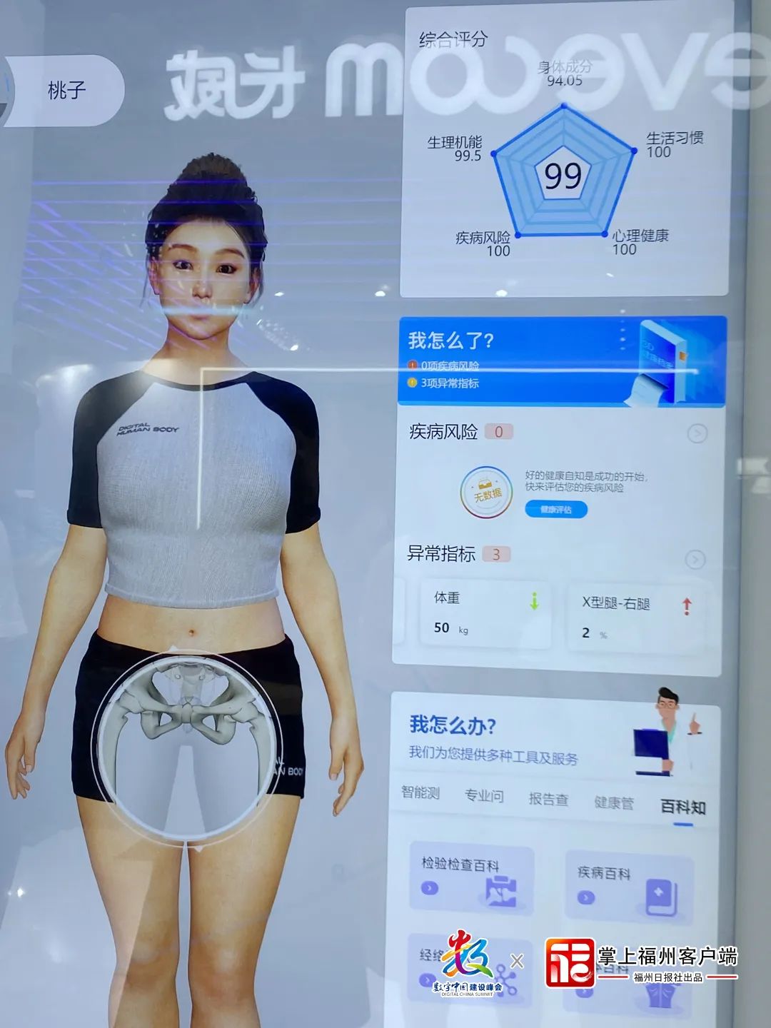 站在屏幕前,人脸扫描后,系统能自动测试出身高、体重,脊椎是否侧弯,腿型是否有O型或X型,内分泌是否正常……还能分析出疾病风险指数。