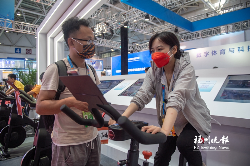 位于成果展5号馆的4B50展位,展示了一批数字体育科技成果,场内设置了几辆健身单车,许多路过的市民上前体验智慧骑行。