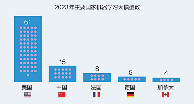 美国领先中国、欧盟和英国,成为顶级人工智能模型的主要开发国家。2023年,61款著名人工智能模型来自美国机构,数量远远超过欧盟的21款和中国的15款。