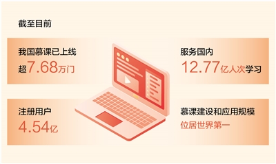 记者从教育部获悉:截至目前,我国慕课已上线超7.68万门,注册用户4.54亿,服务国内12.77亿人次学习,我国慕课建设和应用规模位居世界第一。
