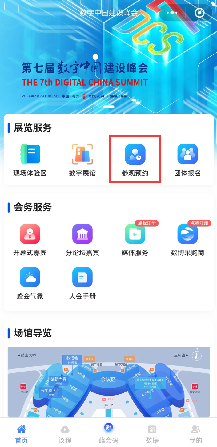 登录数字中国建设峰会小程序,点击“参观注册”进入预约模块,根据提示填写预约信息,就能完成预约了。