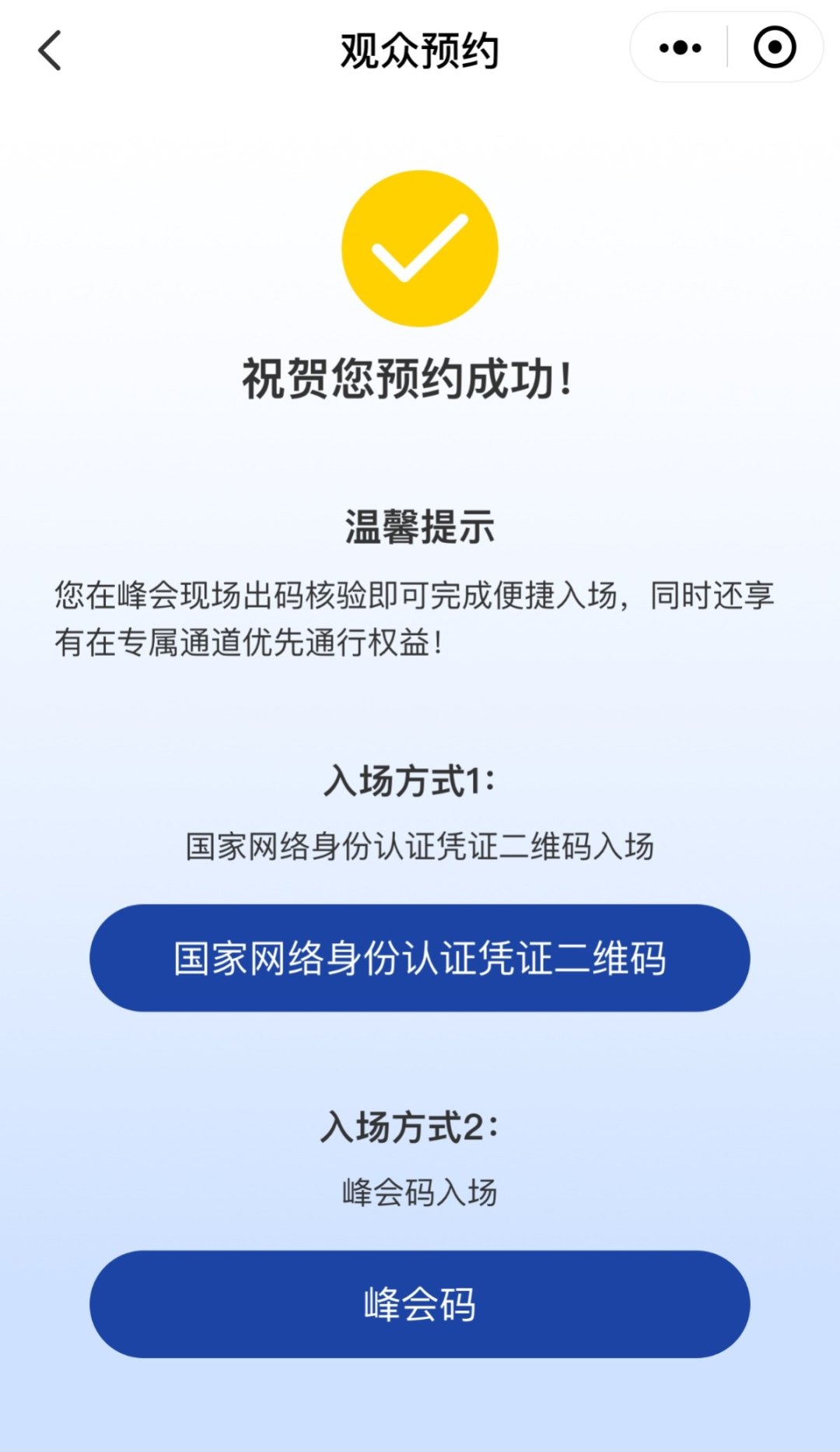 完成上述开通、授权步骤之后,打开峰会官方小程序进行参观预约,即可获得优先通道快速入场的权益。