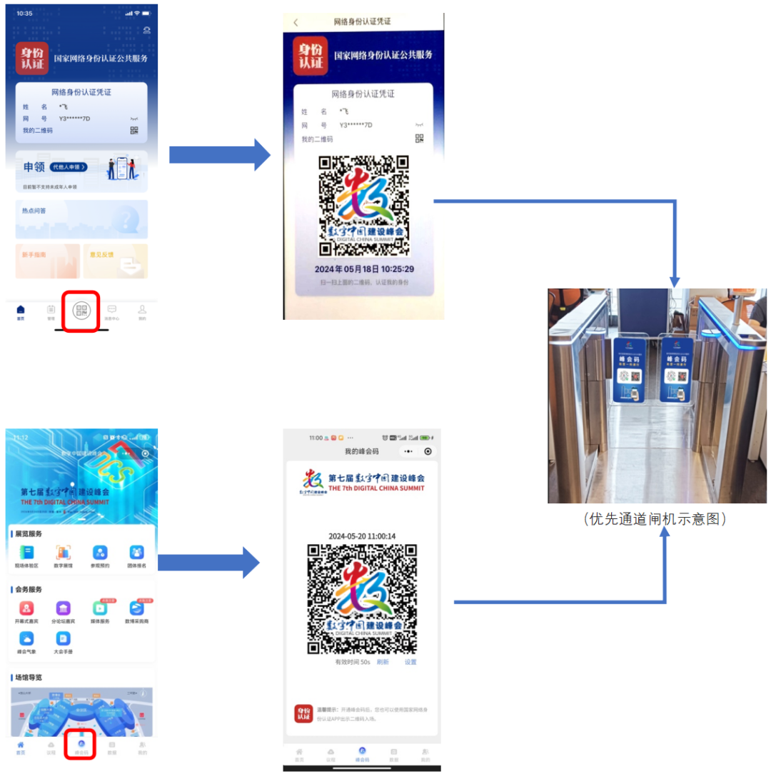 完成以上操作后,进场时在入口处出示国家网络身份认证凭证二维码(通过国家网络身份认证App),或是峰会码(通过峰会官方小程序)(以上任选其一出示),即可优先通行进场!