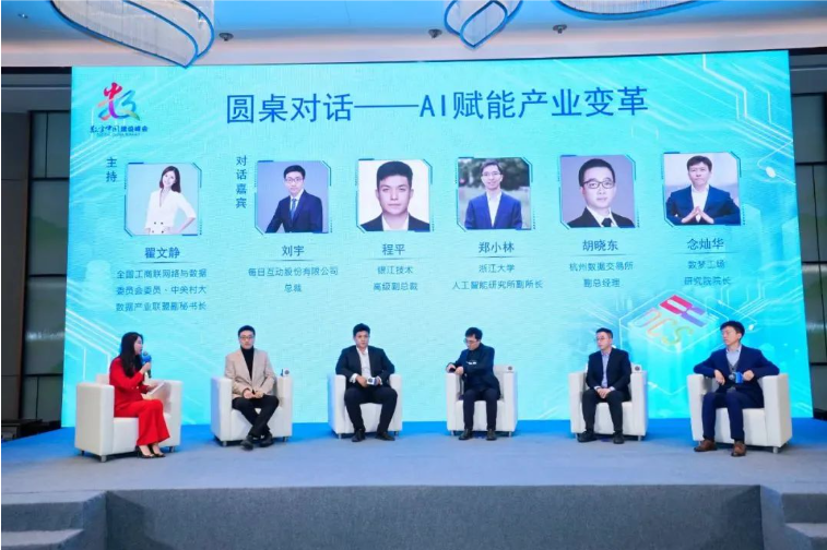 在圆桌对话环节,围绕“AI赋能产业变革”热点话题,每日互动股份有限公司总裁刘宇、银江技术高级副总裁程平、浙江大学人工智能研究所副所长郑小林、杭州数据交易所副总经理胡晓东、数梦工场研究院院长念灿华等来自“产学研用”领域的实践者展开深入探讨。