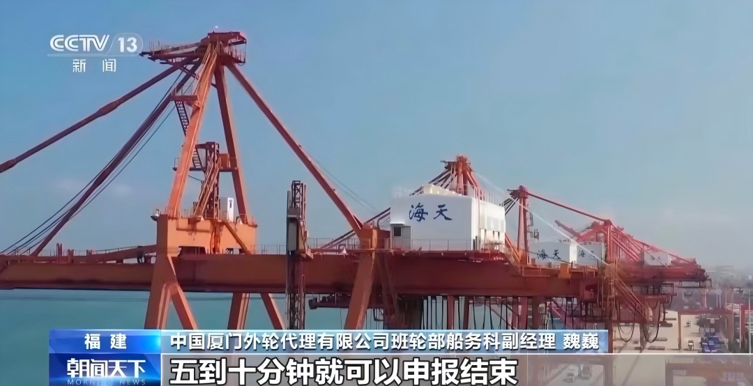 中国厦门外轮代理有限公司班轮部船务科副经理 魏巍:只要进行一次报备,通过审核之后,每个航次来都可以复用这个数据,五到十分钟就可以申报结束。
