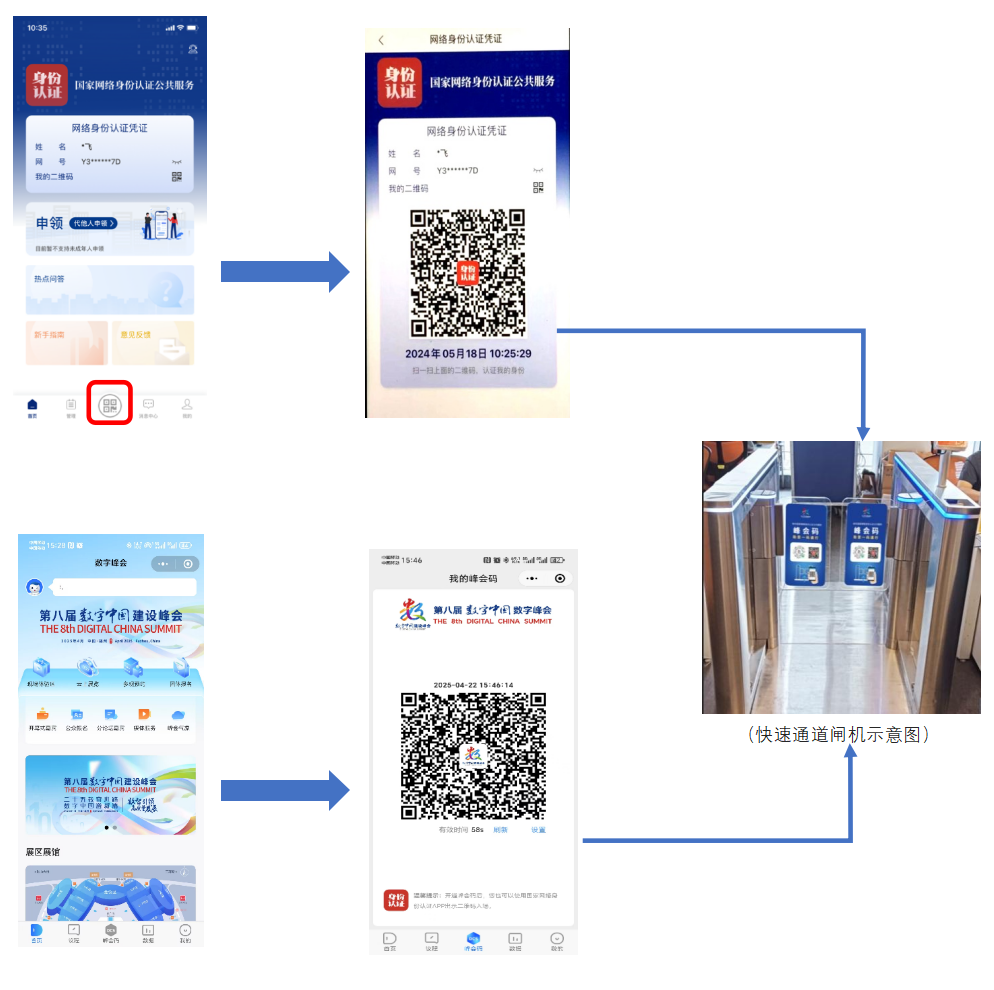 进场时,在优先通道入口处(西登陆厅观众入口)出示国家网络身份认证凭证二维码(通过国家网络身份认证App)或峰会码(通过峰会官方小程序)【任选其一出示】即可快速通行进场!