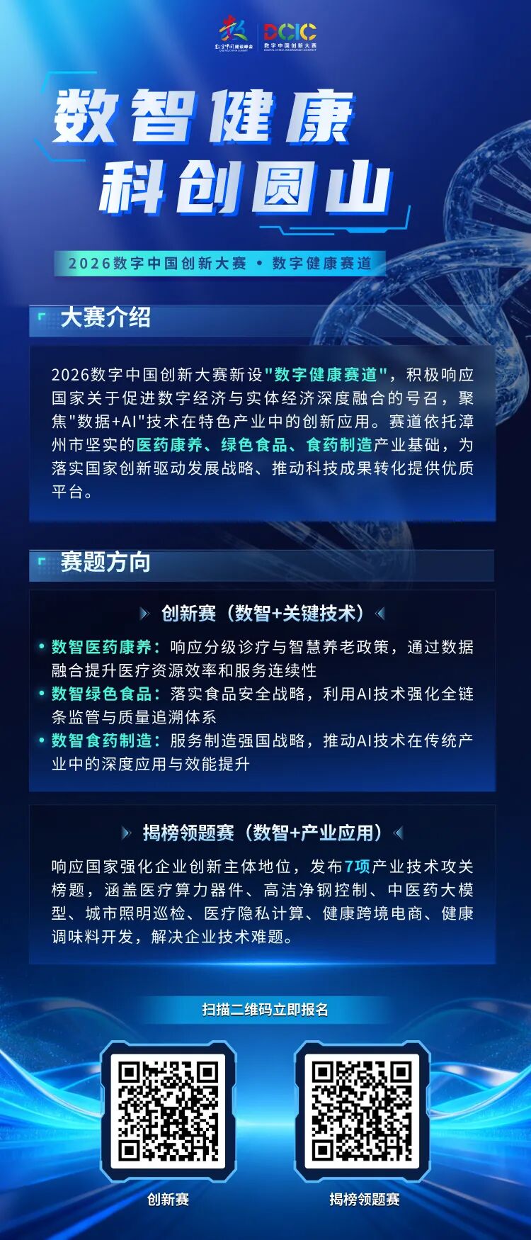 2月12日,2026数字中国创新大赛·数字健康赛道正式上线,报名通道已同步开启。作为本届大赛新增特色赛道之一,由福建省人社厅、漳州市人民政府主办,围绕医疗健康领域,推动人工智能、大数据等数字技术的规范化应用,共探数智赋能健康产业的全新路径。