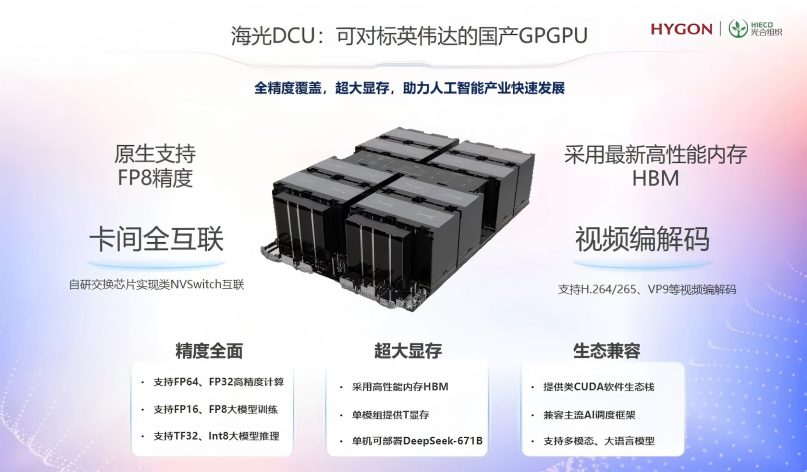 在核心芯片展区,海光信息将集中展示自主研发的系列国产芯片,全方位展现我国在高端处理器领域的关键突破。高性能通用计算CPU,自主可控,性能比肩国际主流,市场占有率领先;深度计算DCU,支持全精度,兼容英伟达生态。